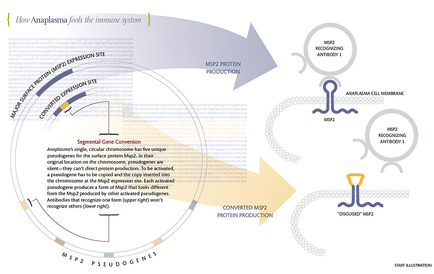 Msp2 changes form when a silent pseudogene is copied and the copy is plugged into the expression site, displacing the pseudogene copy that had been there. Once it is installed in the expression site, a pseudogene is able to create its version of Msp2, whose middle loop differs from the loop in the previous Msp2. Antibodies that recognized the original Msp2 can’t recognize the new form, so Anaplasma cells that are making the new form thrive. It takes the immune system a few weeks to make antibodies against the new Msp2. By that time, another gene conversion event has occurred and a third form of Msp2 is on the scene. If gene conversion involved only whole pseudogenes, Anaplasma would be able to make just five versions of Msp2—not enough to escape attack by the host’s immune system for years. The incredible variety of Msp2 comes about because the pseudogenes can mingle. Guy Palmer and Kelly Brayton found that slivers of up to four pseudogenes can be combined at the expression site. Each combination creates a form of Msp2 that’s different from previous forms—different enough so that antibodies that recognized earlier forms won’t recognize the new one. Palmer estimates that the system enables Anaplasma to make at least 1,024 different versions of Msp2. Click on infographic for larger size