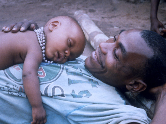 Whereas Western fathers are often the rough-and-tumble playmates of their children, Aka are more likely to hug and kiss them. Western fathers tend to play a more extrinsic role in the life of the child, says Hewlett, assuming the responsibility of introducing the child to the outside world. Mothers are more responsible for the emotional-social aspect. That model simply does not apply to the Aka, he says, where fathers are actively involved in all aspects of the child’s being. “Aka infant attachment to fathers seems to occur through regular and sensitive caregiving.”