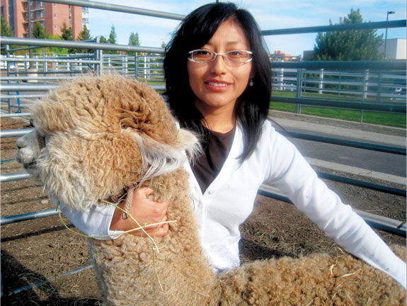 Yessenia Picha ’12 comes from a family of alpaqueros, or alpaca ranchers. She grew up around the curious, long-lashed creatures raised mostly for the fiber made from their soft, durable fleeces. With 80 percent of the world’s alpaca population residing in Peru, it’s no surprise that after completing her veterinary degree at the Catholic University of Santa Maria, she worked for an agricultural social services agency in the area of genetic improvement of the animal.