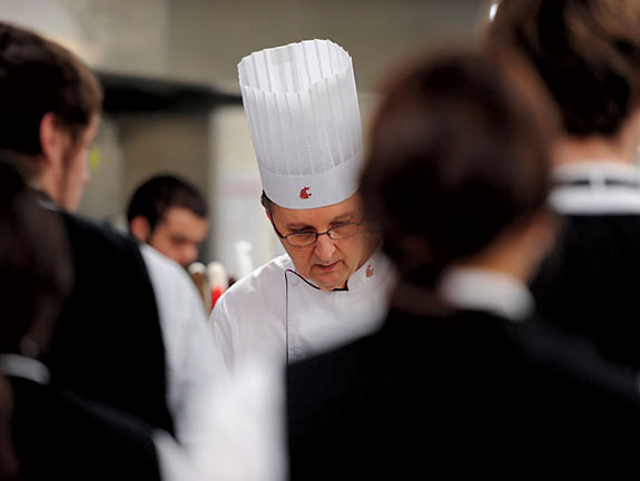 Come 6:30, student waiters and waitresses in black ties will serve the food on individual plates, a timing play that ups a chef’s game from, say, a buffet. If the food is ready too soon, lettuce will get flat, chicken will get dry, strawberries will bleed into frosting. If it is late, well, no one likes to keep hundreds of hungry people waiting.