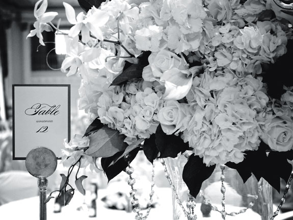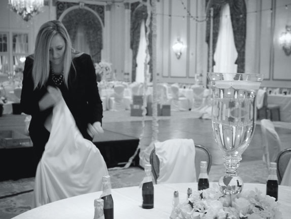 “Oh, this is a pretty wedding,” says Schroader, surveying the room and opening her list and seating chart to run a quick check. She sweeps past the cake table to pick up the bride and groom topper, takes another look around the room, and heads down a long cool hallway to the kitchen, where a pastry chef is assembling and frosting the cake.