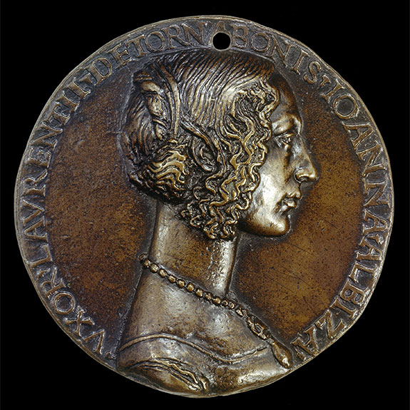What’s so special about Giovanna is that there are at least five known representations of her, says DePrano. They include bronze medals or coins that feature her likeness on one side and the three graces on the other. The medals may have been made to commemorate her marriage to Lorenzo. It is rare, she explains, to link an extant medal to an actual woman whose name we knew. Many women in pieces from this era are impossible to identify.