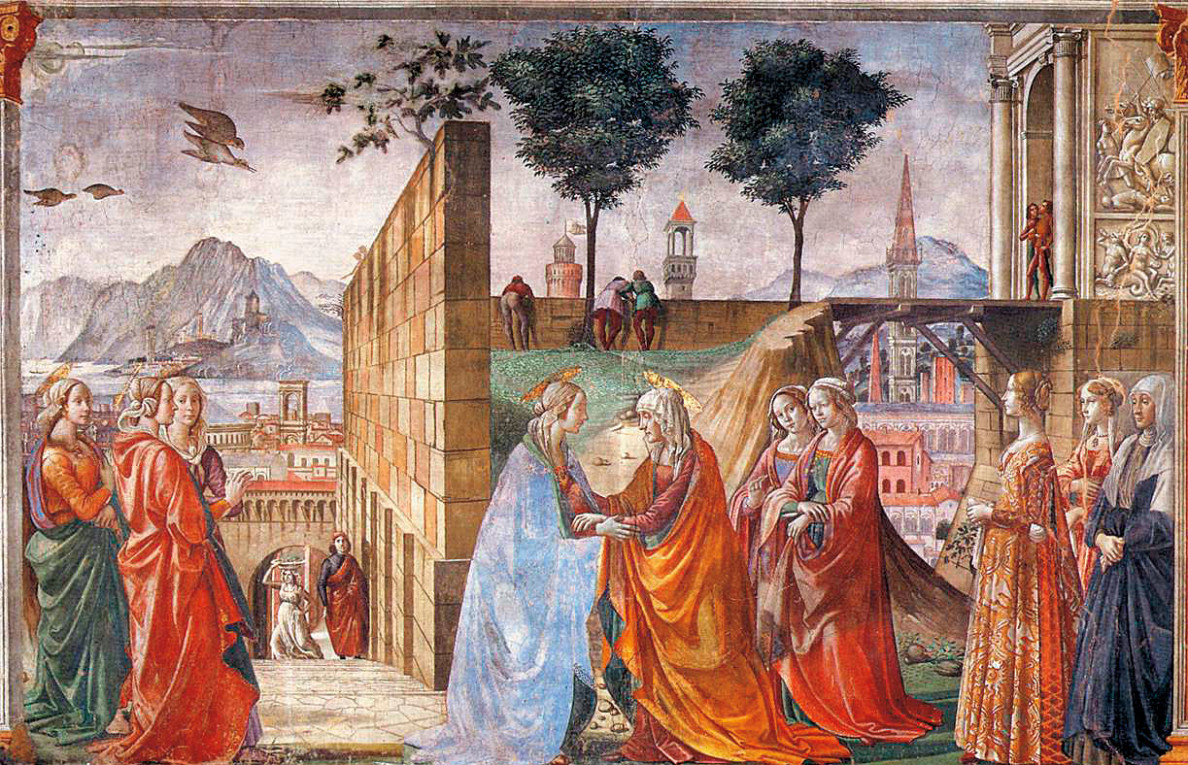 Giovanni Tornabuoni, the paterfamilias, lived in Rome for decades working for the Medici bank. He was also part of a Florentine delegation to Pope Innocent IV. Tornabuoni bought the rights to decorate the main chapel at Santa Maria Novella. He commissioned Domenico Ghirlandaio, lauded for his portraiture, to create frescoes with the themes of the births and lives of the Madonna and of John the Baptist. The design was to tell their stories in a series of panels and include representations of himself and his family and friends.