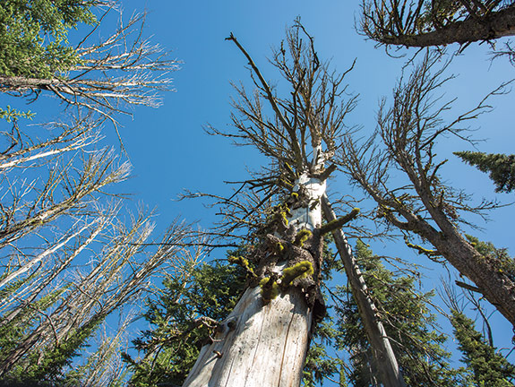 After burrowing through the tree’s bark, the beetles make a J shape in the phloem, the bark layer that takes nutrients from the leaves to the roots. A year after an attack, the tree’s needles turn red and eventually fall, leaving a ghost forest.