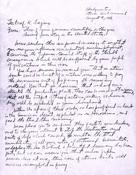 The letter, addressed to “R. Sagane, Imperial University, Tokyo,” was an appeal from three Manhattan Project physicists to fellow physicist and former colleague Ryokichi Sagane. They asked Sagane to confirm the power and devastation of the nuclear attack to the Imperial Japanese government, and to urge Japan’s surrender.