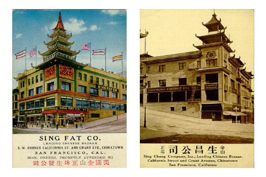 “The Chinatown that was remade following the 1906 earthquake was a giant marketing scheme in the image of what urban elites wished for tourists to continue to see in Chinatown … The massive Sing Chong and Sing Fat buildings are pure western constructions with a ‘chinoiserie’ of Ming-style details like tiled roofs, pagodas, and ‘oriental’ colors.”