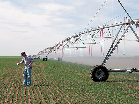 Bailie ’95 pumps irrigation water from a well drilled down 800 feet. Neighbors have pushed wells down to 2,000 feet. At such depths, the water is often laden with salts and minerals. After a while of irrigating with this water, a crust can form over the soil surface. Farmers must use a variety of means to break up the crust, including acid, so the irrigation water can soak in.