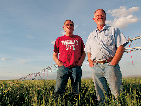 With his brother Gavin and nephew Nick, Johnson ’69 farms 6,000 acres, irrigating from deep wells, just outside of Othello. The big “Go Cougs” potato storage shed east of Othello belongs to the Johnsons.