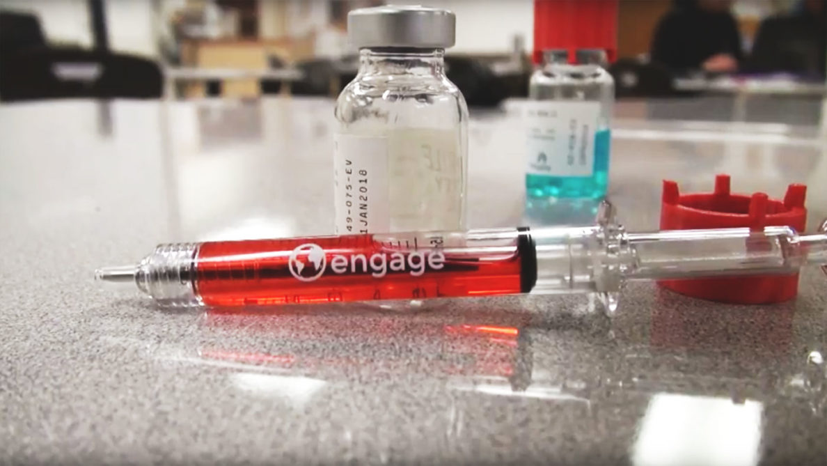 Willard and Brandenstein started their company, Engage, with the SafeShot needle-sterilizing lid. SafeShot’s sterilizing liquid stops the spread of common contaminants such as Hepatitis B, Hepatitis C, and HIV.