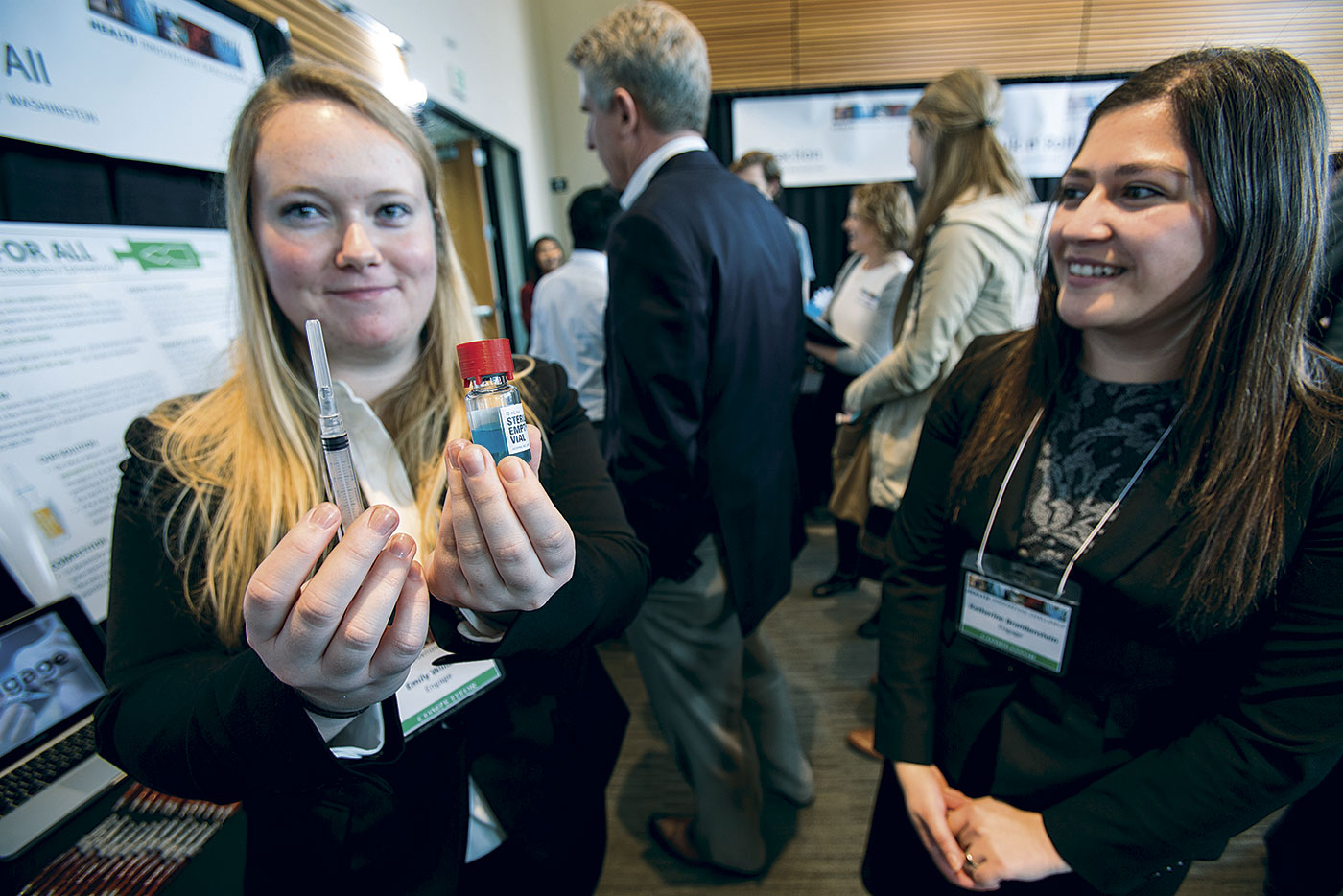 Emily Willard and Katherine Brandenstein came up with the idea of SafeShot, a lid that sterilizes a needle each time it enters the vial of medicine, as part of an entrepreneurship class. The two students started a company, won a health business contest last spring, and headed to Tanzania early this year to research how their product could be used in a real setting.