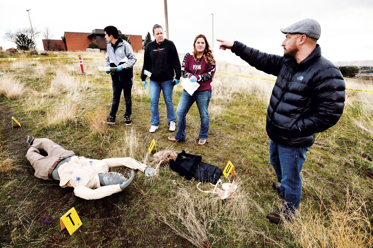 Matt DeGarmo critiquing forensic science students on their crime scene investigation in a field lab at Blue Mountain Community College in Pendleton, Oregon.