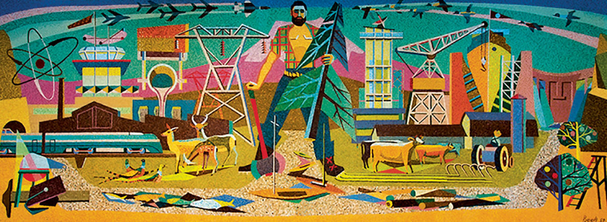 The artist, Jean Cory Beall, had assembled the mural—commissioned by the State Capitol Committee—in 1959 on a gently curved wall of un-reinforced four-inch masonry with a ceramic coating inside the state’s now-mothballed General Administration Building in Olympia.