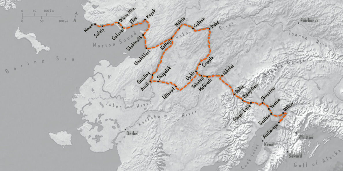 The 975-mile northern route crosses two mountain ranges, runs along the Yukon River, and stops at 24 checkpoints. Sled dogs run about 100 miles and require ten to twelve thousand or more calories per day.