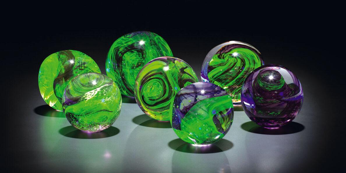 “You can see there’s an inner world,” Ichikawa says about the pulsating blue and green glass orbs she created for the exhibit. “I can see an association with the world and the ocean. The uranium and radioactive material react to UV light. If you don’t have UV light, you don’t really see it.