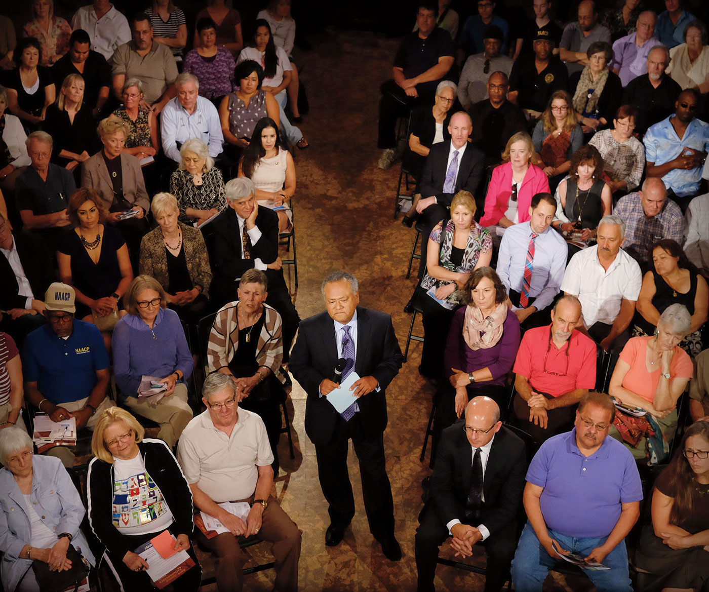 Journalist Enrique Cerna with a microphone and note cards among seated people at a Yakima town hall