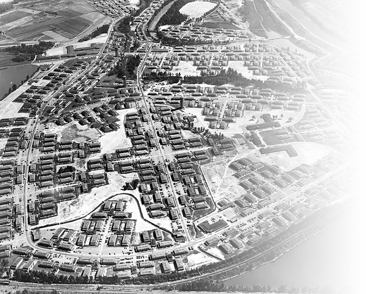 Portland struggled to house the influx of defense workers—particularly Black residents who were only allowed to live in the Albina neighborhood. Kaiser took matters into his own hands. His son, Edgar, worked with the US Maritime Commission to purchase 650 acres north of city limits. The low-lying acreage was between the Columbia River and the Columbia Slough.