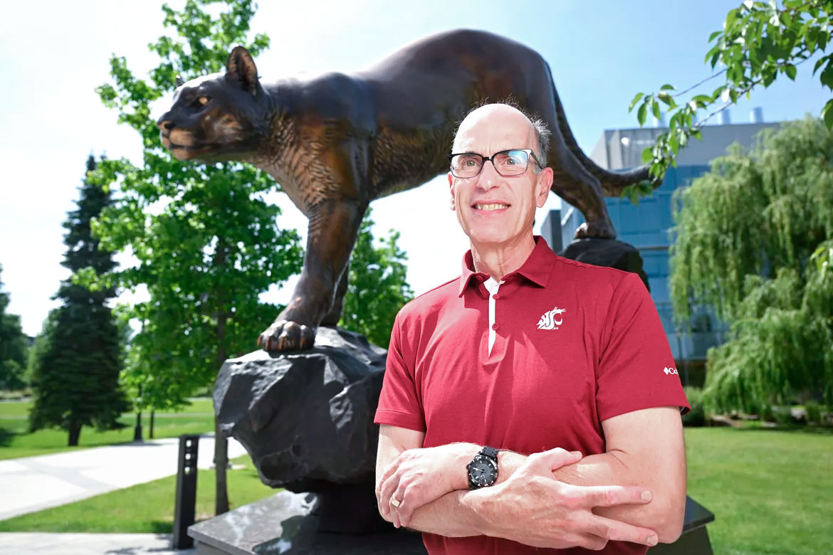 Terry Kelly in crimson WSU polo shirt stands in front of bronze cougar statue