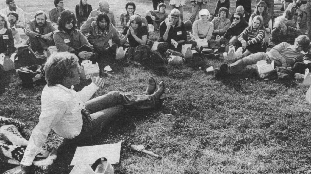 Black-and-white photograph of a man seated cross-legged on grass with arms extended, addressing a group gathered outdoors.