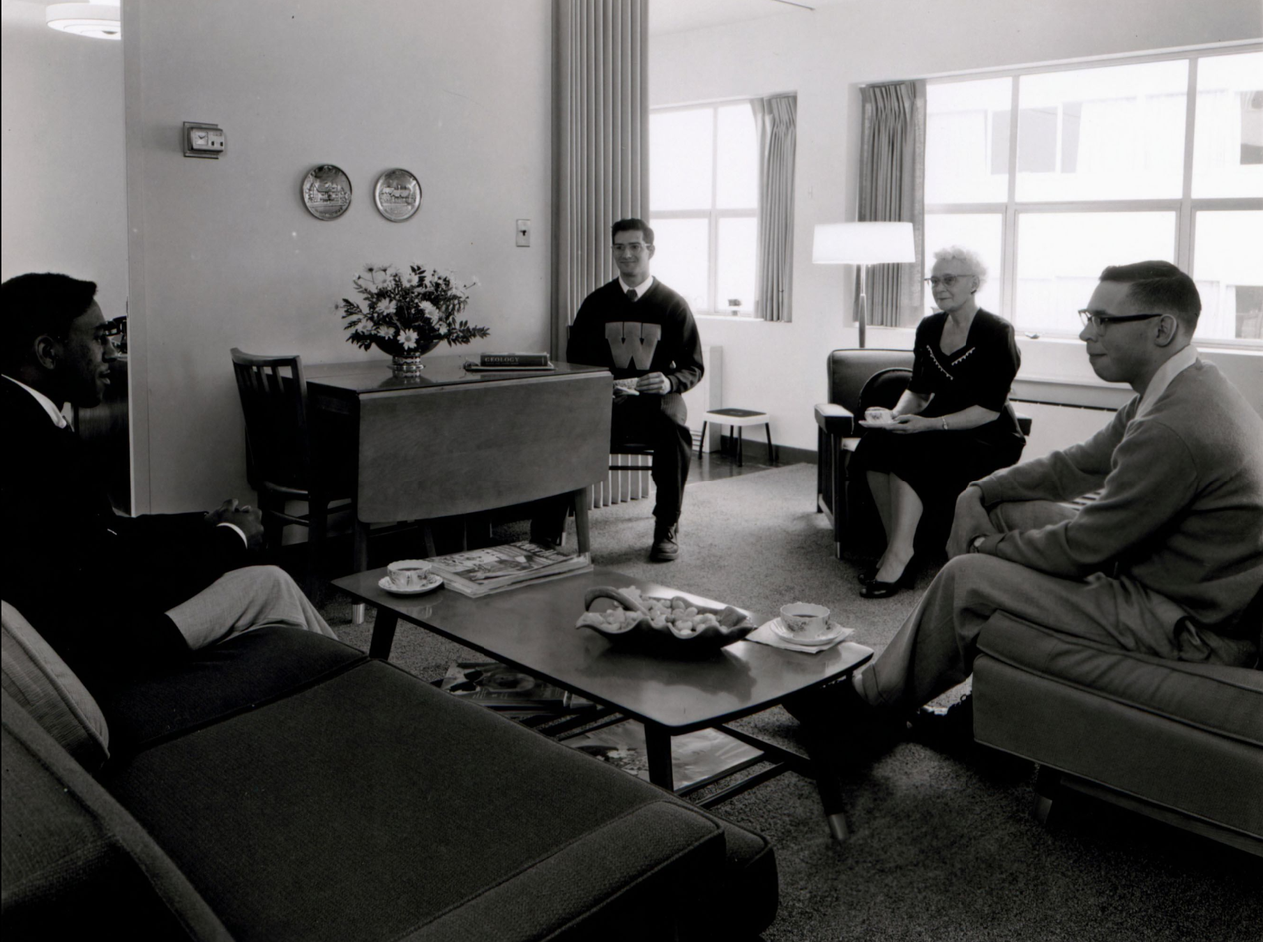 The lounge between Kruegel and McAllister Halls was a place for students to meet. (1957)