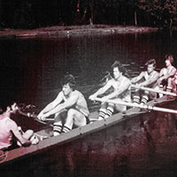 The boathouse was a different story. It had no electricity, no running water, and no restrooms. Sometimes, student-athletes—often covered in kitchen grease—would use the headlights from their vehicles to help them see inside. To lubricate the oarlocks and slides, Kimbrell says, they used Crisco “‘cause it was cheap. We’d get that grease on the back of our legs.”