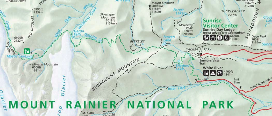 Getting There: From Enumclaw, drive east 43 miles on State Route 410 to the Mount Rainier National Park White River Entrance. Veer right onto the Sunrise Road and follow it 17 miles west to the large parking lot and visitor center at the road’s end. Note: Sunrise Road usually doesn’t open until early July.