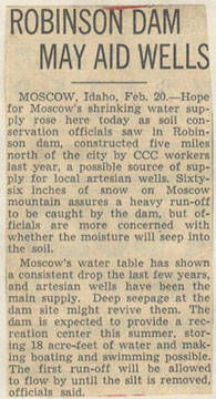 Newspaper clipping: Robinson dam may aid wells. Hope for Moscow’s shrinking water supply rose here today as soil conservation officials saw in Robinson dam, constructed five miles north of the city by CCC workers last year, a possible source of supply for local artesian well