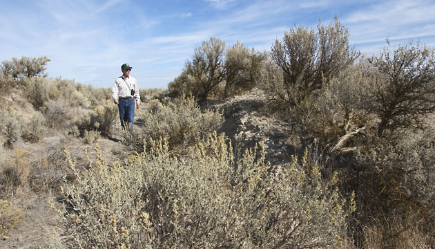 Bob Kent, former manager of the Columbia Basin project for the state of Washington, walks through an area of the native shrub steppe sage brush environment in the Columbia Basin project area near Moses Lake, Washington.
