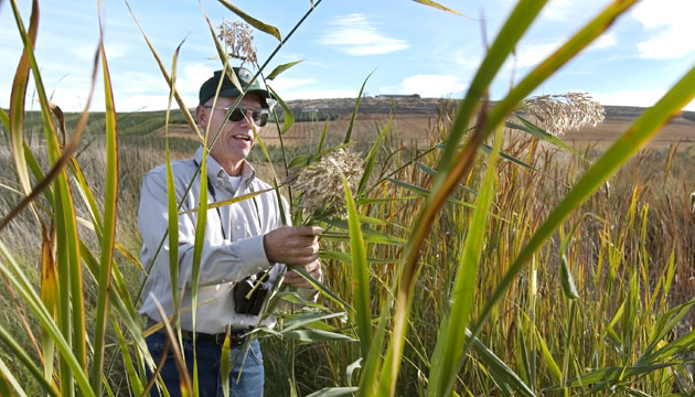 Bob Kent pulls the heads off a patch of the invasive grass, phragmites, which fills in around the edge of wetland areas.