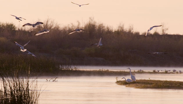 Egrets and gulls fish in the Crab Creek arm of Potholes Reservoir near Moses Lake.