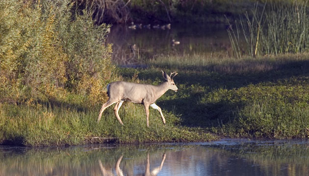 A buck moves along the shoreline in the Crab Creek section of Potholes Reservoir, while ducks swim in the pond behind it.