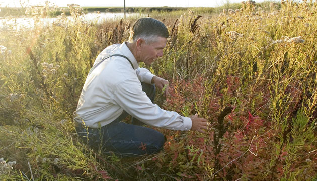 Bob Kent inspects an area where purple loosestrife used to thrive. The late-season red leaves show the marsh-destroying invasive plant isn’t totally eradicated, but it has been beaten back since Kent led a fight against it when he was wildlife manager.