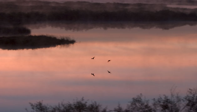 “Ducks skim low over the waters of the Crab Creek arm of Potholes Reservoir at sunrise.