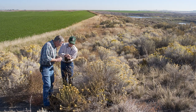 Lee Williams (left) and Bob Kent check seeds from plants growing in a shrub steppe wildlife buffer that Williams maintains at the edge of his irrigated alfalfa field. Behind them are some of the ponds that form the Lind Coulee Wasteway for returning irrigation water.