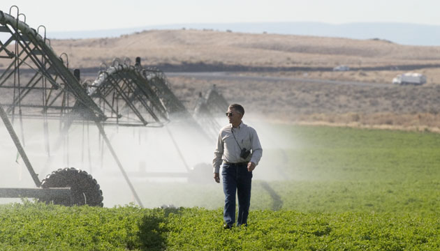 Bob Kent walks through one of Lee Williams’s irrigated fields adjacent to the shrub steppe landscape.