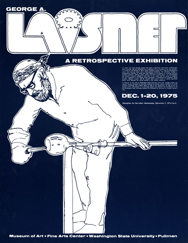 George Laisner, a well-known former WSU artist and teacher, came to Washington State College in 1937 having studied at the Chicago Art Institute and the University of Chicago. He was dynamic and enthusiastic teacher and his creative interests were wide. He exhibited extensively on the West Coast and received many honors for his work in the areas of painting, lithography, etching, scuplture, ceramics, and glass. In 1976 he received the (Washington State) Governor’s Arts Award. He died in 1984 having spent nearly 40 years on the WSU Fine Arts faculty.