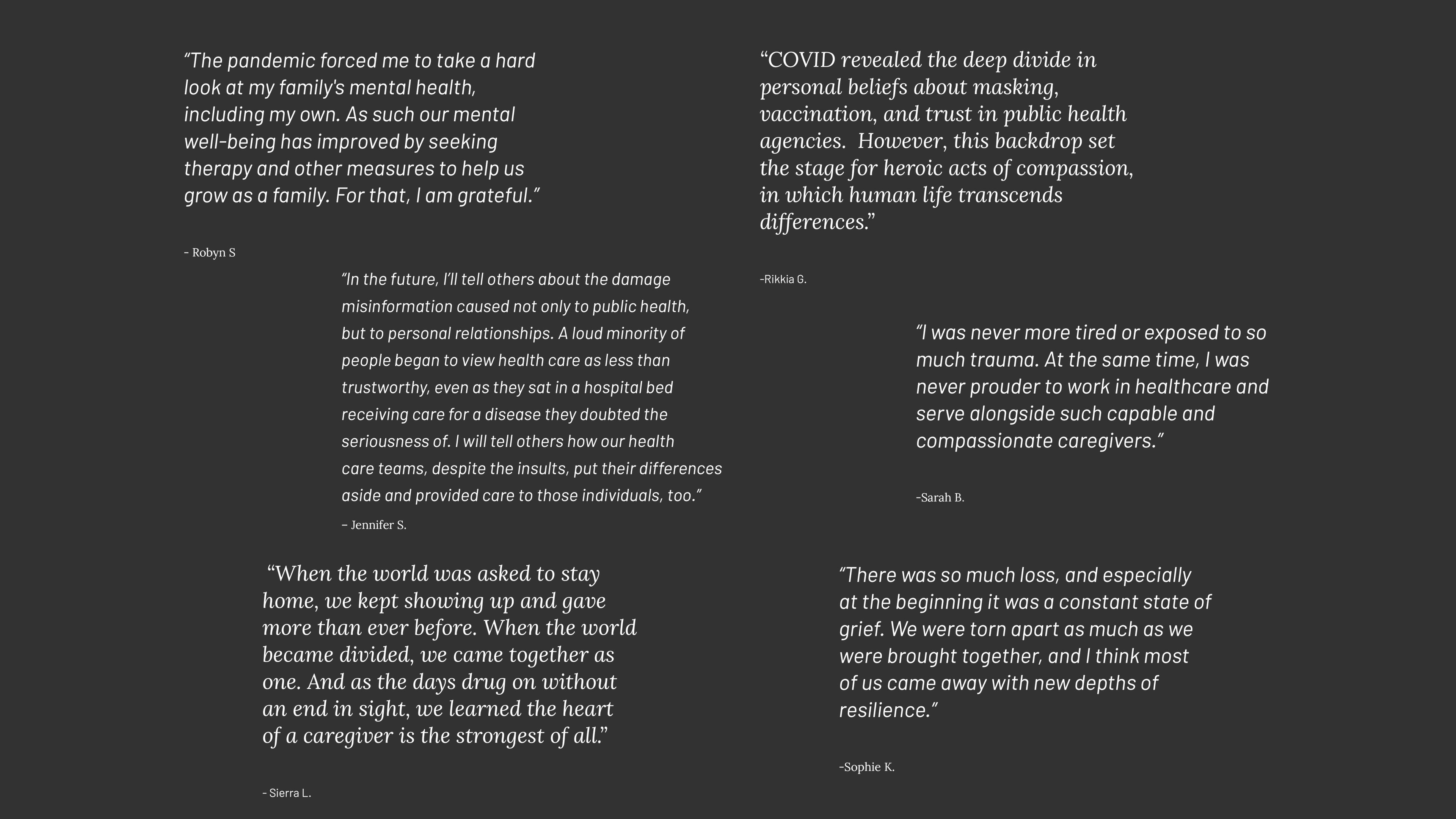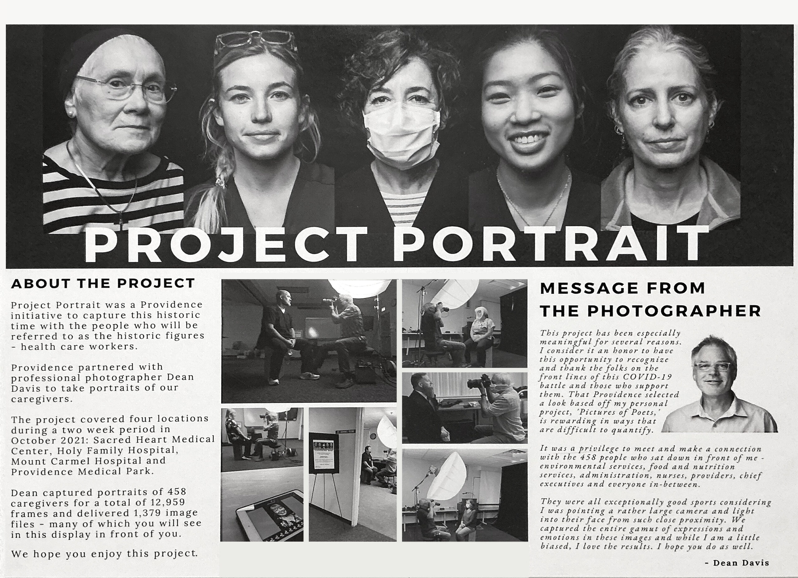 “Project Portrait,” launched in 2021 during the height of the COVID-19 pandemic, was a project to photograph caregivers at the Providence hospitals in the Inland Northwest. Dean Davis of Spokane was contracted to capture portraits displaying the range of emotions of the health care workers dealing with the pandemic. The participants were also asked the question: “In 20 years from now, when someone asks you about the pandemic, what will you say?”